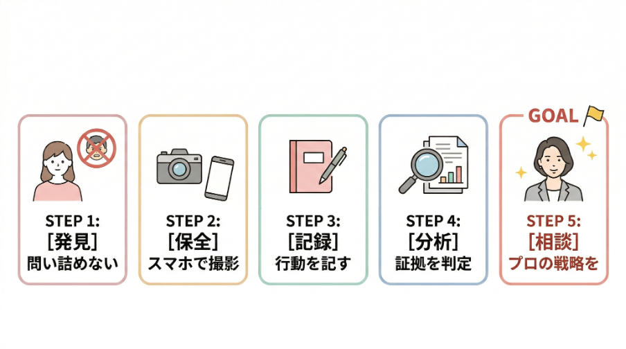 「『問い詰めない、自分で調査しない』—この2つをまずは守ってください。ネット上の『スマホを勝手に見ても大丈夫』という情報を鵜呑みにしてはいけません。違法に収集した証拠は、あなた自身を犯罪者にしてしまうリスクがあるのです。」